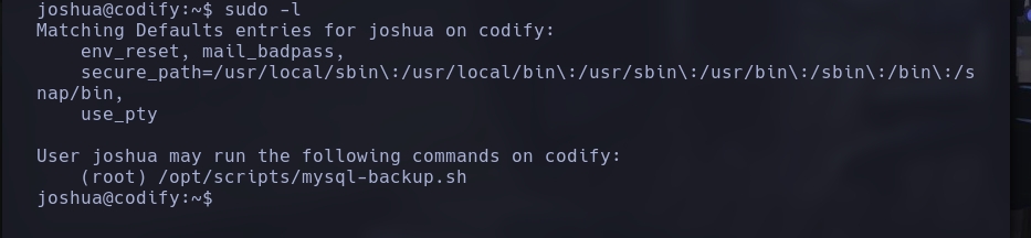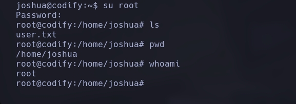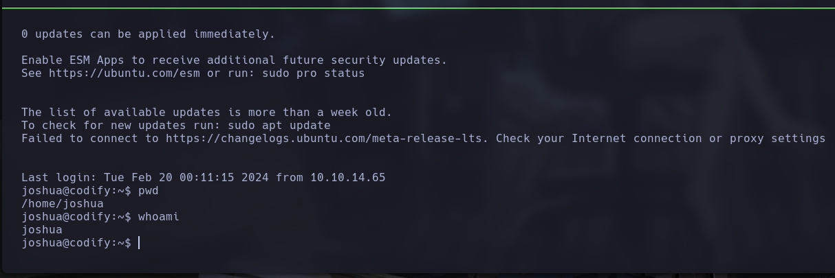 Conseguimos crackear el hash ;). Por lo que probamos las credenciales, ssh joshua@codify.htb.