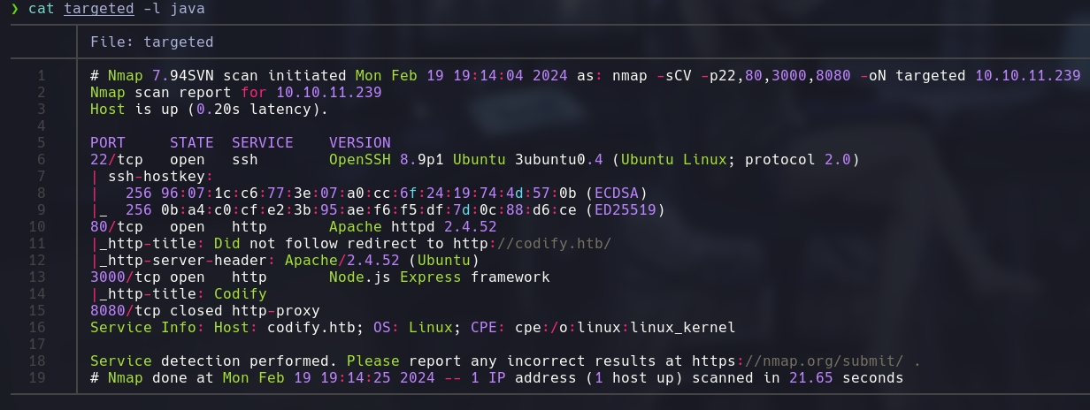 Posteriormente, realizamos un escaneo más detallado de los puertos identificados utilizando la opción -sCV para detección de versiones y scripts de enumeración de servicios. Específicamente, indicamos los puertos a escanear con -p __PORTS__ (reemplazando __PORTS__ con los puertos identificados en el paso anterior) y guardamos la salida en un archivo de texto con el nombre targeted:
