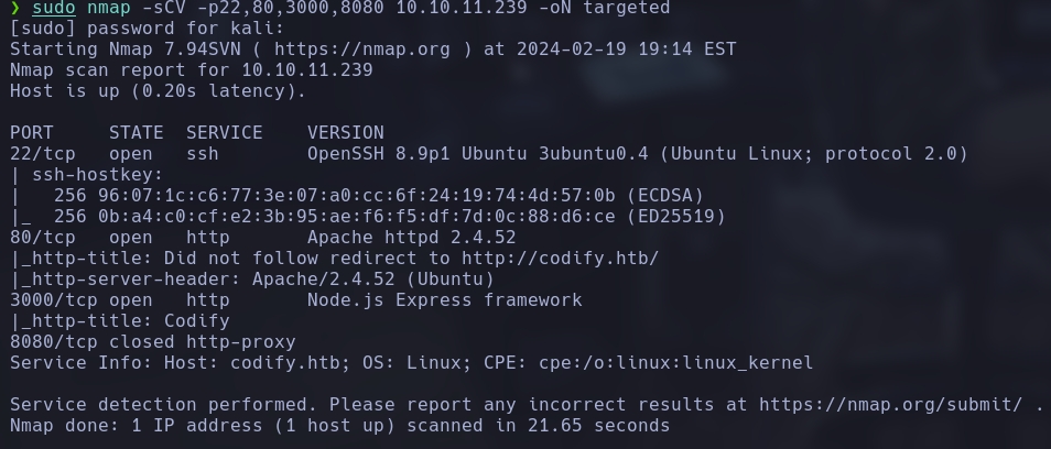 Este comando añade la dirección IP 10.10.11.239 asociada al nombre de host codify.htb al archivo /etc/hosts de tu sistema.