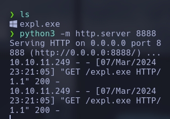 El ultimo paso era subir un servidor Python en el mismo directorio donde teniamos nuestro expl.exe generado por mfsvenom. Para luego descargarlo desde nuestro equipo victima.