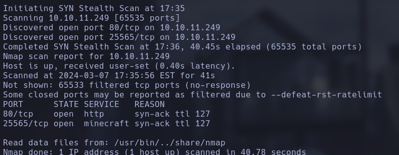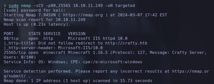 sudo nmap -sCV -p80,25565 10.10.11.249 -oN targeted
