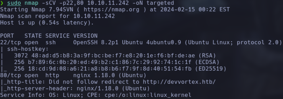 Posteriormente, realizamos un escaneo más detallado de los puertos identificados utilizando la opción -sCV para detección de versiones y scripts de enumeración de servicios. Específicamente, indicamos los puertos a escanear con -p __PORTS__ (reemplazando __PORTS__ con los puertos identificados en el paso anterior) y guardamos la salida en un archivo de texto con el nombre targeted: