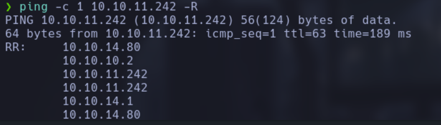 Realizamos un ping a la máquina objetivo para verificar la conectividad y obtener información sobre la ruta utilizando la opción -R para incluir la ruta de retorno: