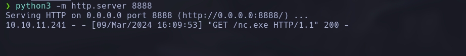 Y con éxito podemos ver que la maquina a descargado nuestro nc.exe.