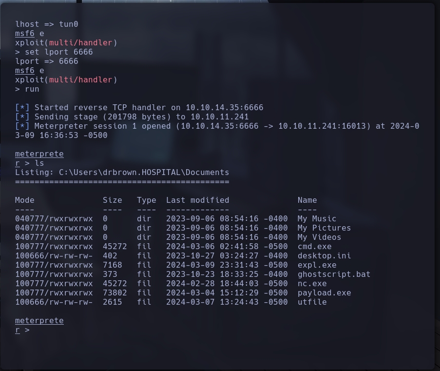 Decido generar otro payload pero ahora utilizando el archivo nc.exe que descargamos y conectandonos a nuestra máquina. Nuevamente debo enviarle un correo a la victima con nuestro nc a la escucha en el puerto 6666.