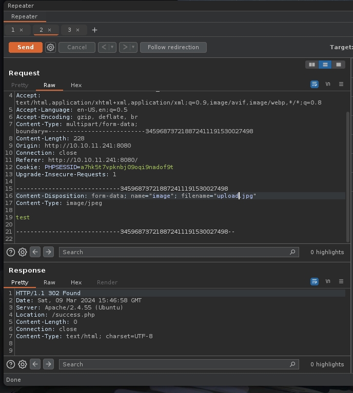Primero creamos nuestra imagen para luego subirla con el uploader al sitio, usamos Repeater de Burpsuite para modificar el contenido de la imagen.