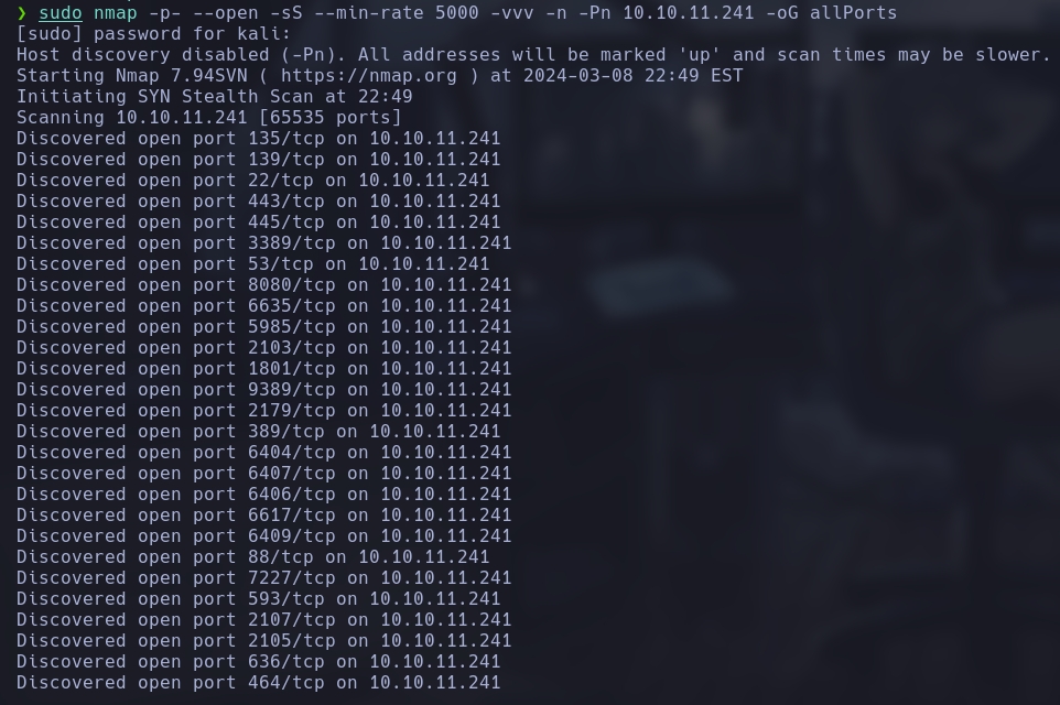 sudo nmap -p- --open -sS --min-rate 5000 -vvv -n -Pn 10.10.11.241 -oG allPorts