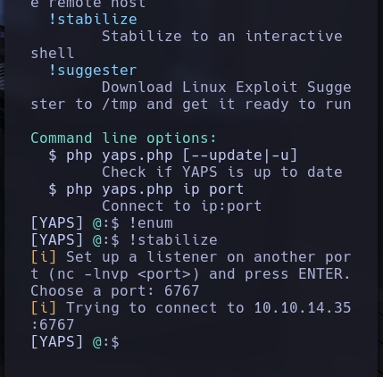 Recuerda configurar la shell apuntando a tu maquina y a tu a puerto. Con YAPS me deja "estabilizar la shell"...