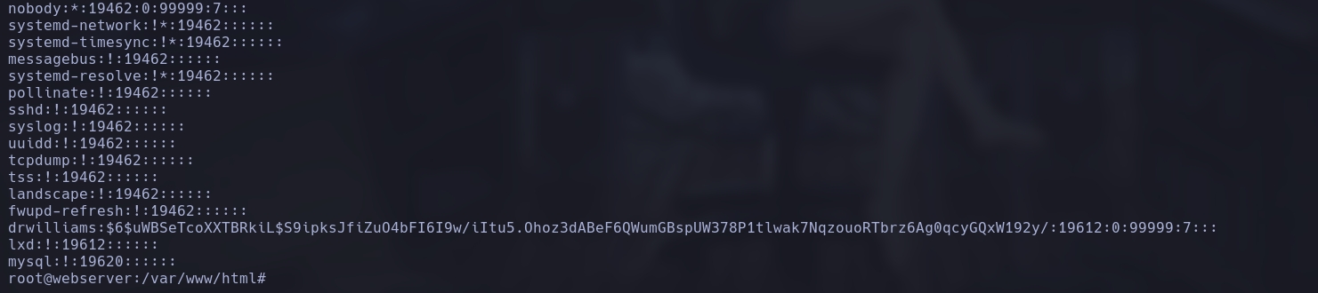 Para encontrar el hash de drwilliams y luego crackeamos el hash con john.