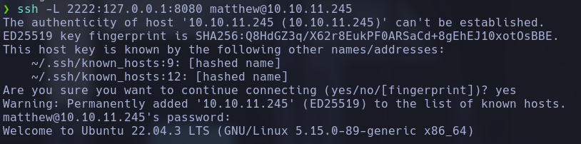 matthew@10.10.11.245: es el usuario y la dirección IP del servidor remoto al que se va a conectar a través de SSH.