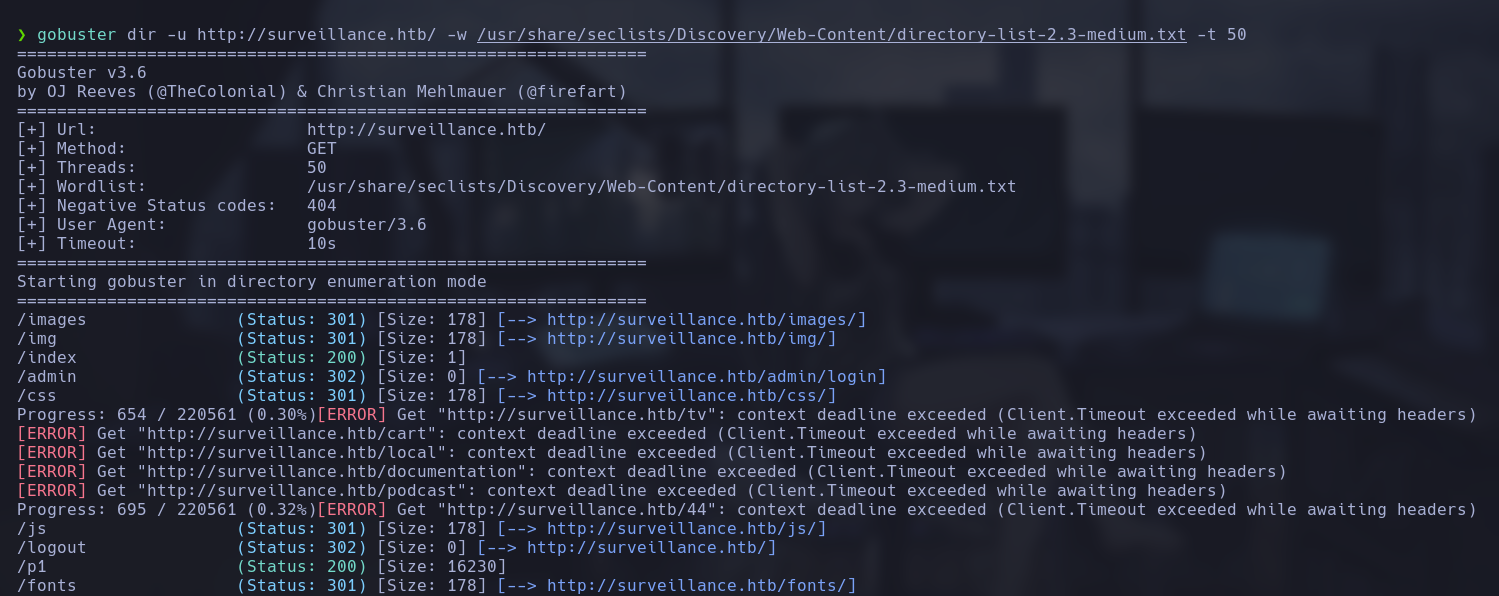 Este comando utiliza Gobuster para realizar un escaneo de directorios en el sitio web http://surveillance.htb/. Utiliza el archivo de palabras /usr/share/seclists/Discovery/Web-Content/directory-list-2.3-medium.txt como lista de palabras clave para la búsqueda. La opción -t 50 indica que se deben utilizar 50 threads simultáneos para acelerar el proceso.