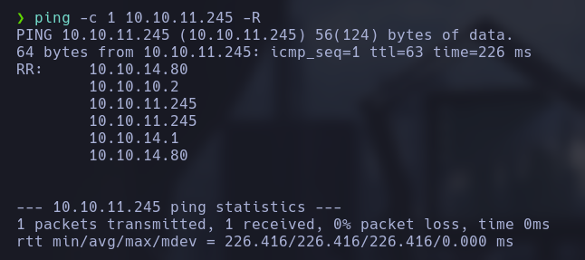 Realizamos un ping a la máquina objetivo para verificar la conectividad y obtener información sobre la ruta utilizando la opción -R para incluir la ruta de retorno:
