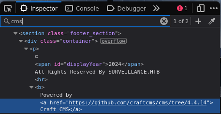 Durante una de nuestras incursiones en la red, nos topamos con un hallazgo interesante: una dirección específica que nos llevó directamente a un panel de administración de un sitio web: http://surveillance.htb/admin/login. Al inspeccionar la página, nos dimos cuenta de que estaba potenciada por "CraftCMS", y aún más intrigante, la versión se revelaba sin recato en el index.php como la 4.4.14.