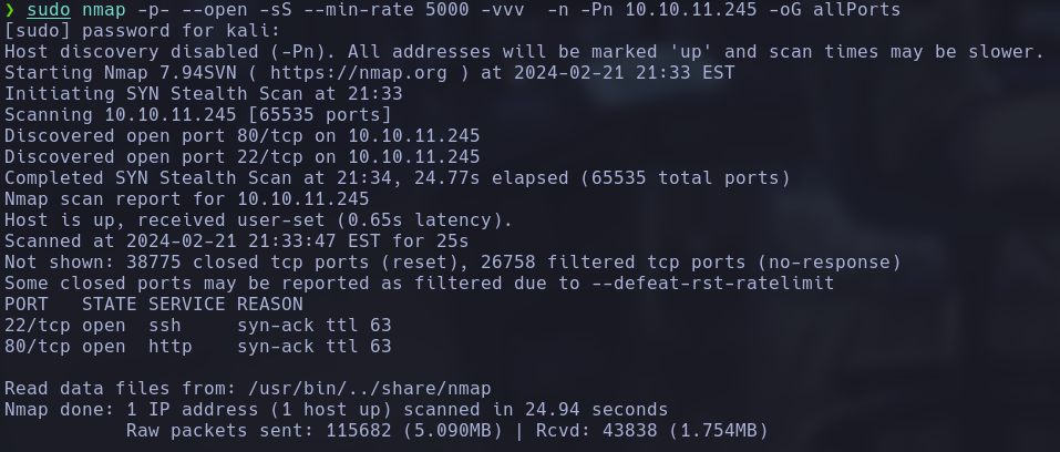 Luego, realizamos un escaneo de puertos utilizando Nmap para identificar los puertos abiertos en la máquina objetivo. Utilizamos las opciones -p- para escanear todos los puertos, --open para mostrar solo los puertos abiertos, -sS para un escaneo de tipo TCP SYN, --min-rate 5000 para establecer la velocidad mínima de paquetes y -vvv para un nivel de verbosidad alto. Además, utilizamos -n para desactivar la resolución de DNS, -Pn para no realizar el escaneo de ping, y -oG allPorts para guardar la salida en un archivo con formato Greppable: