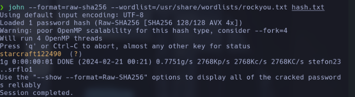 Una vez identificado el tipo de hash como raw-sha256, procedimos a intentar crackearlo utilizando la herramienta John the Ripper. Esta herramienta es ampliamente utilizada para realizar ataques de fuerza bruta y diccionario contra contraseñas cifradas.