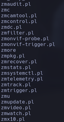 Al parecer hay archivos en /usr/bin/ llamado zm*.pl que podrían ser de ayuda: