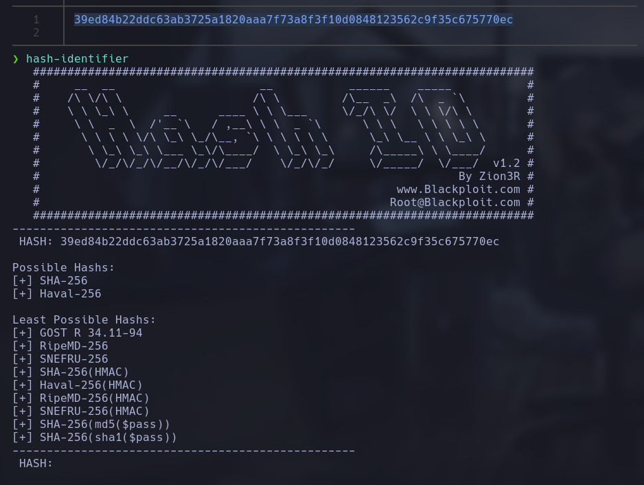 Una vez que obtuvimos el archivo .sql y luego el hash, nuestro siguiente paso fue identificar el tipo de hash para determinar la mejor manera de crackearlo. Para esto, utilizamos la herramienta hash-identifier, que nos permitió analizar el hash y determinar su posible algoritmo de hash subyacente.