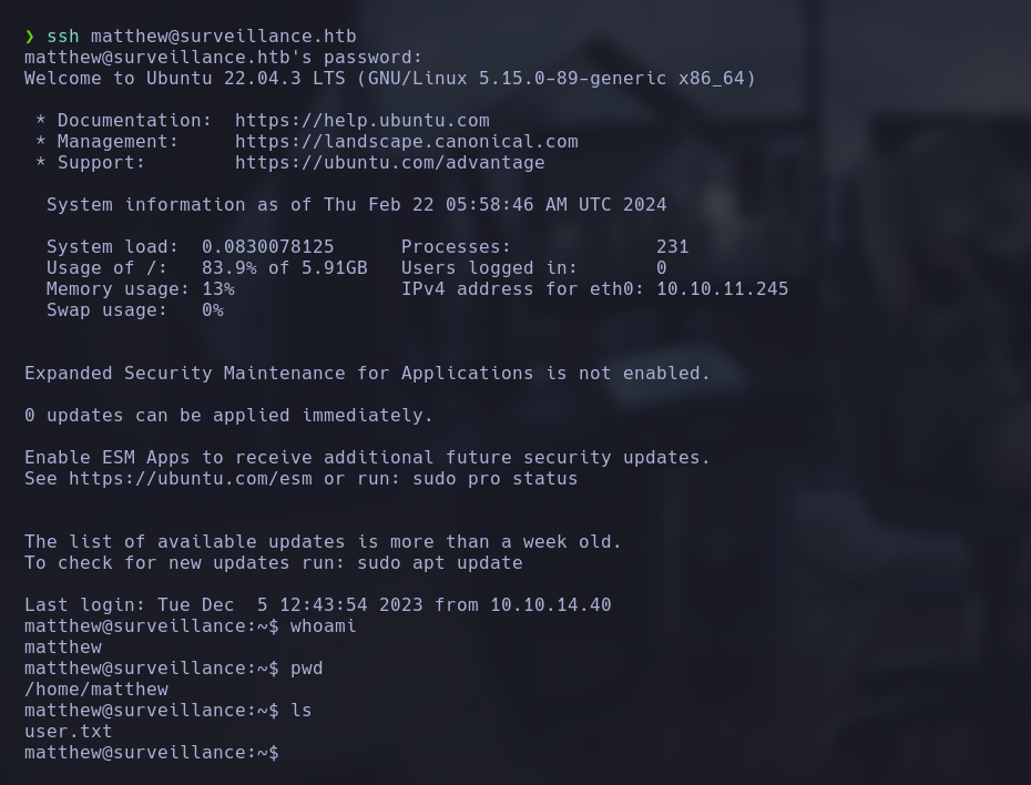 Intentamos ingresar por ssh con las credenciales de matthew@surveillance.htb y este es el resultado: