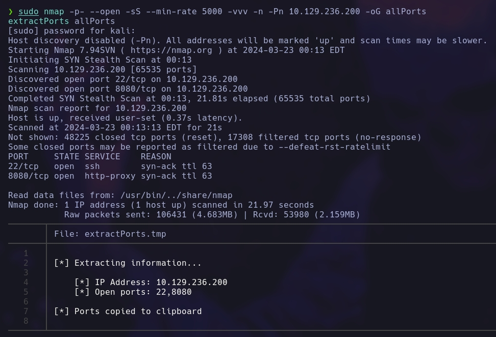sudo nmap -p- --open -sS --min-rate 5000 -vvv -n -Pn 10.129.236.200 -oG allPorts