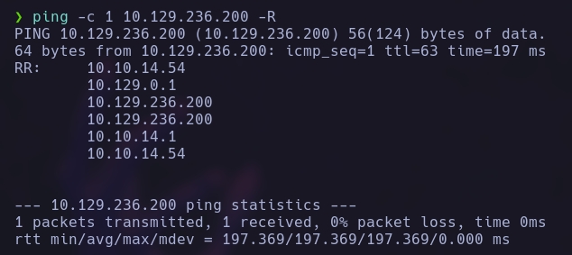 Realizamos un ping a la máquina objetivo para verificar la conectividad y obtener información sobre la ruta utilizando la opción -R para incluir la ruta de retorno: