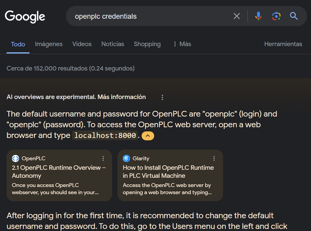 Buscamos las credenciales por defecto en Google, openplc:openplc