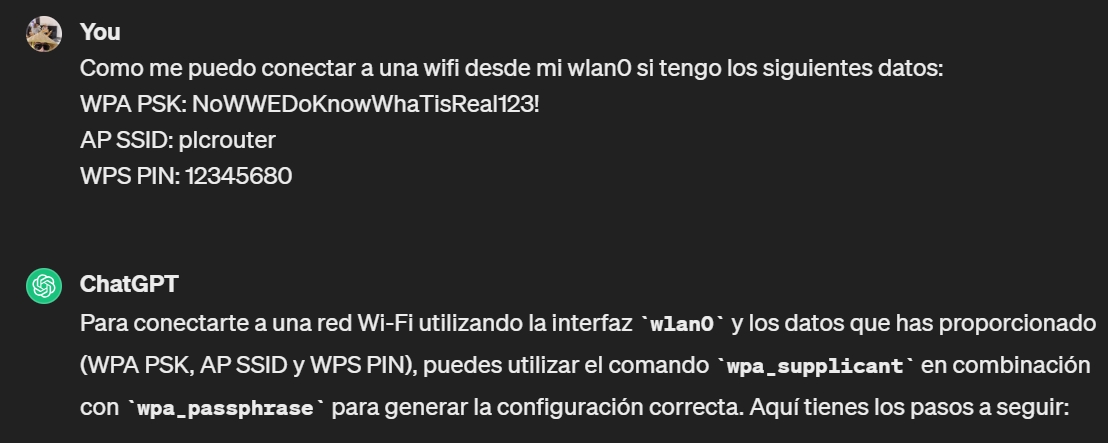 WPS PIN: 12345680Entonces ya teniendo las credenciales de la WiFi lo que quiero es acceder a ella, conectarme a la WiFi, y la verdad no tengo idea de cómo hacerlo así que le pregunto a ChatGPT: